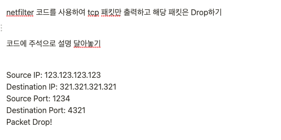 이번 과제는 netfilter 코드를 사용하여 tcp 패킷만 출력하고 해당 패킷은 Drop 하는 것.