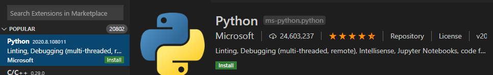 마침 제일 먼저 나타난 python 을 install하겠습니다.